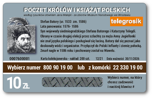 Kontynuujemy serię kart wydawanych przez TP S.A. Poczet Królów i Książąt Polskich rysowanych ołówkiem przez Jana Matejkę